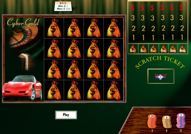 まず、円の中にチップを置いてスクラッチ・チケットを購入します。ゲームを始めるため、「PLAY」ボタンを押します。すると16の四角があるチケットが現れますので、マウスの左側のボタンを押し続けたままチケット上を動かすか、または単に「CLEAR」ボタンをクリックすることによりチケットを削ってください。 | |